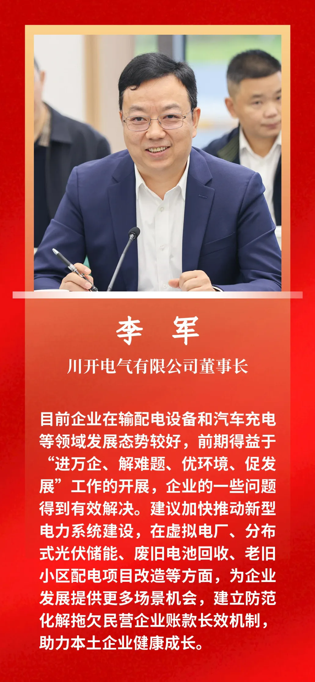 座談會上,特銳德川開電氣等18家民營企業(yè)代表先后發(fā)言,介紹了企業(yè)發(fā)展情況,圍繞科技創(chuàng)新、產(chǎn)業(yè)轉(zhuǎn)型、人才引育、營商環(huán)境、要素保障等提出了意見建議。特銳德川開電氣董事長李軍在會議發(fā)言時表示,目前公司在輸配電設備和汽車充電等領(lǐng)域發(fā)展態(tài)勢較好,前期得益于進萬企、解難題、優(yōu)環(huán)境、促發(fā)展”工作的開展,企業(yè)的一些問題得到有效解決。同時,建議加快推動新型電力系統(tǒng)建設,在虛擬電廠、分布式光伏儲能、廢舊電池回收、老舊小區(qū)配電項目改造等方面,為企業(yè)發(fā)展提供更多場景機會,建立防范化解拖欠民營企業(yè)賬款長效機制,助力本土企業(yè)健康成長。