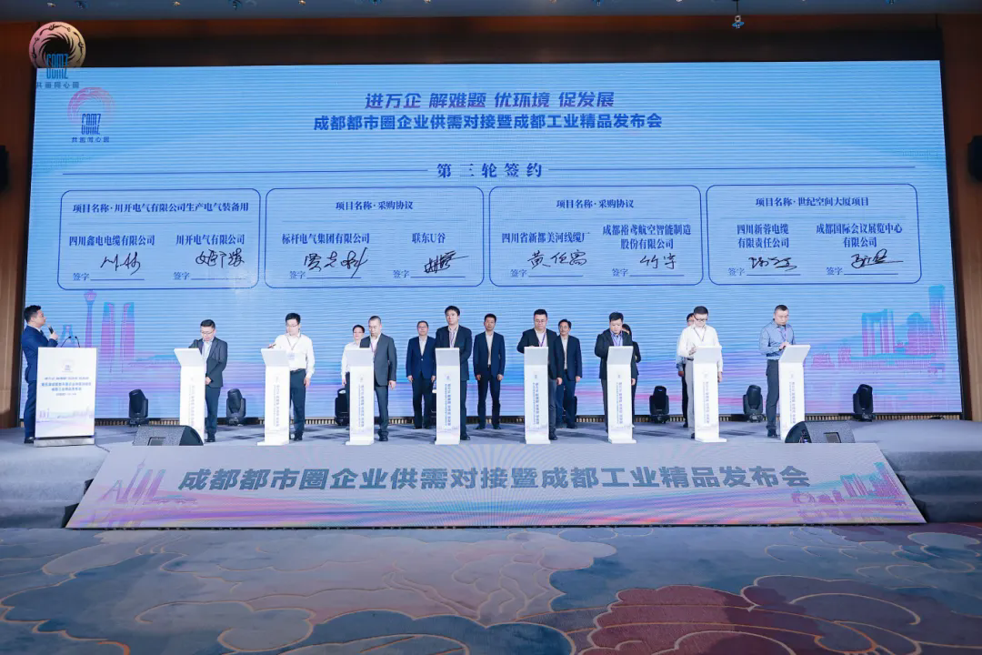 同時,圍繞成都都市圈企業(yè)供需兩端,32家工業(yè)精品企業(yè)和龍頭企業(yè)簽約總金額達(dá)10.84億元。其中,特銳德川開電氣與四川鑫電電纜有限公司順利完成了生產(chǎn)電氣裝備簽約。