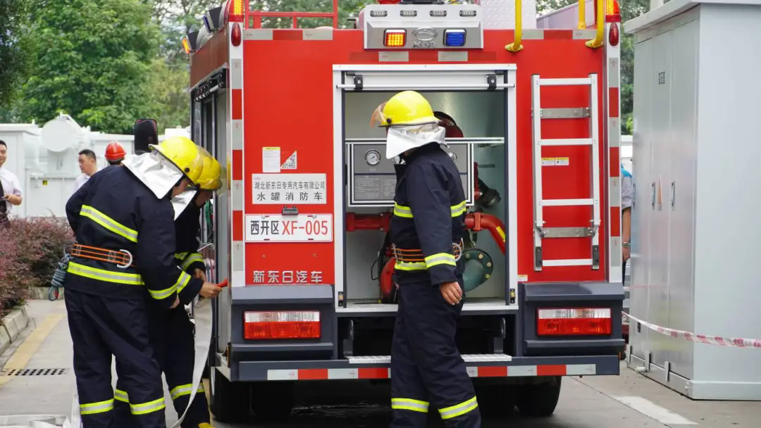 伴隨著應急警報在公司各區域響起,特銳德川開電氣全體人員按疏散指示標識有序撤離,穿過彌漫的煙霧,全體人員紛紛以最快速度安全撤離至公司緊急疏散集合地點。同時,西開區管委會功能產業第五社區消防救援隊在接到公司報警后,第一時間迅速趕至特銳德川開電氣火災演練事故點進行火災救援,并順利撲滅火源。