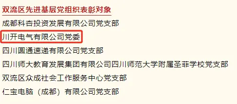今年是中國共產黨成立103周年,為進一步激勵各級黨組織和廣大黨員干部奮勇爭先、建功立業,省委、市委、區委分別決定,表彰一批優秀共產黨員、優秀黨務工作者和先進基層黨組織。其中,中共川開電氣有限公司委員會榮獲雙流區先進基層黨組織。