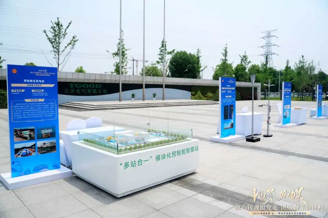 為著重展現雙流“新質”生產力和幸福“保障力”,活動外場區域特設企業展示區、職工關愛區及主題創意打卡區,旨在彰顯雙流產業多元成果、傳遞雙流工會溫暖力量、營造“五一”勞動節日氛圍。其中,特銳德川開電氣展出了“多站合一”模塊化預制艙智能站沙盤,并詳細介紹了公司的預制艙式變電站產品。