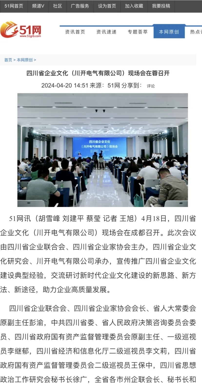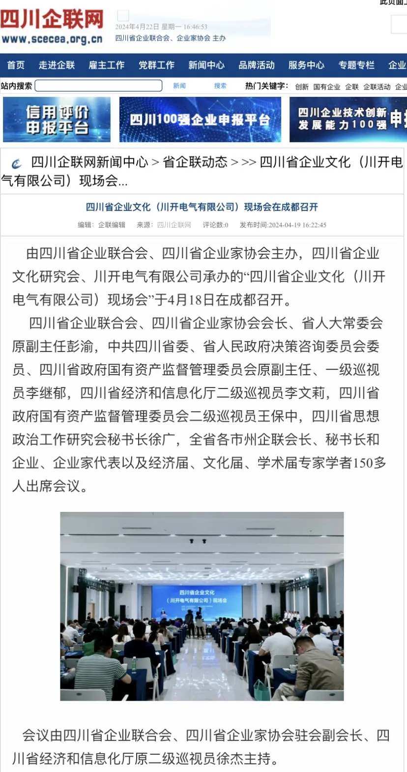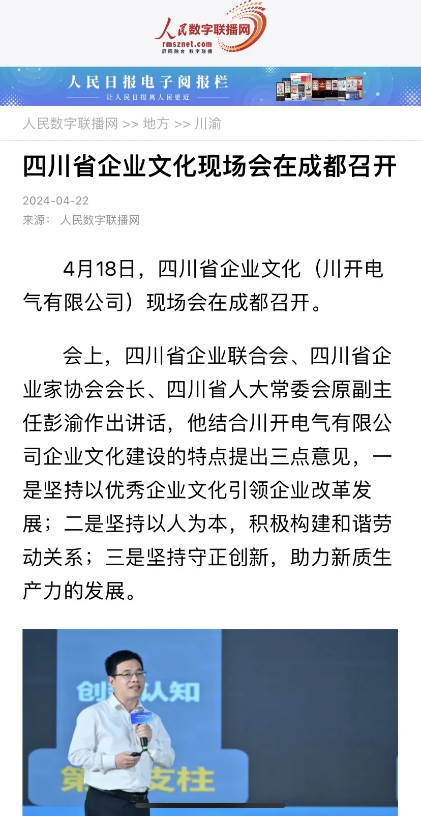 作為推進四川省企業(yè)文化建設與企業(yè)高質(zhì)量發(fā)展盛會,4月18日,四川省企業(yè)文化(川開電氣有限公司)現(xiàn)場會成功舉行。本次大會吸引了全國多家主流媒體宣傳報道,聚焦推廣四川企業(yè)文化“優(yōu)秀樣板”,取得了影響范圍廣、傳播熱度高等成效。