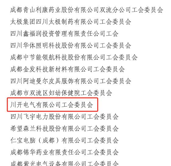 近日,成都市總工會通報了2023年四、五星級企事業單位工會和四、五級鎮(街道)、產業園區工會評定結果,川開電氣有限公司工會委員會通過了2023年成都市五星工會評定,光榮入選五星級最高級別企事業工會名單。