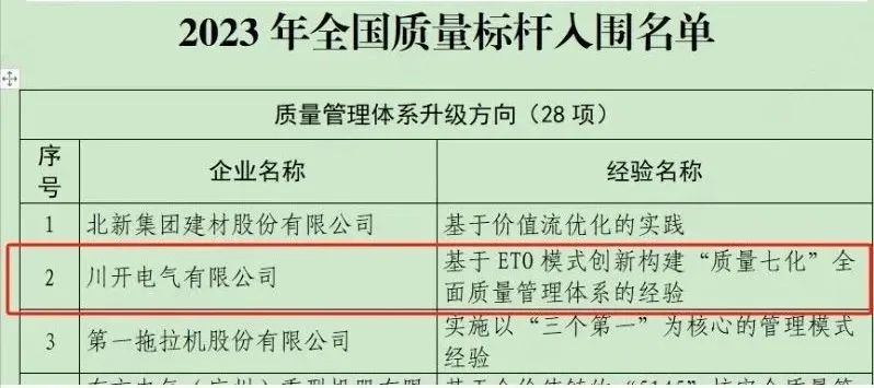 近日,特銳德川開電氣基于ETO模式創新構建“質量七化”全面質量管理體系的經驗光榮入圍2023年全國質量標桿名單。