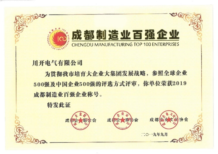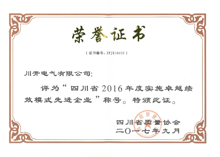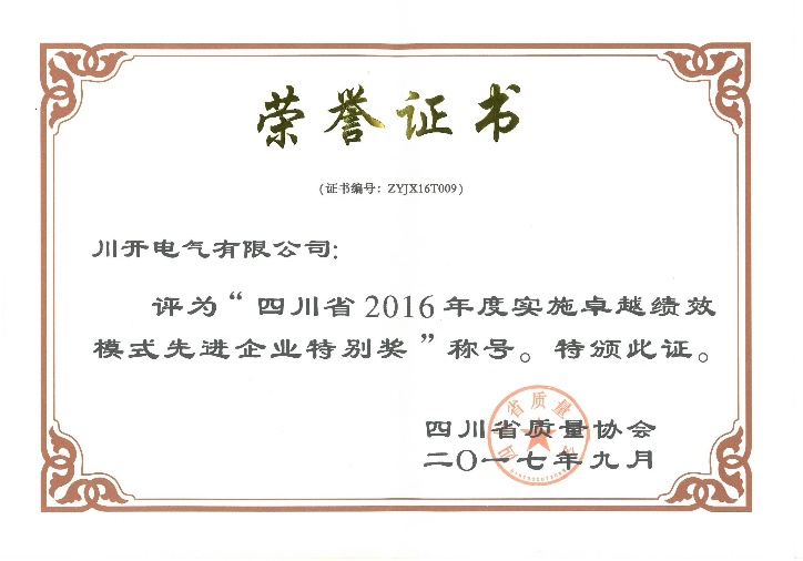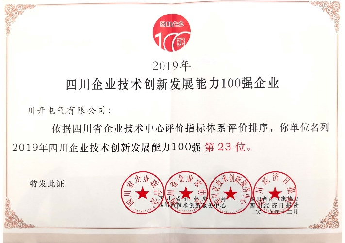 過(guò)去幾年川開(kāi)電氣獲得的榮譽(yù)獎(jiǎng)項(xiàng)有:國(guó)家級(jí)高新技術(shù)企業(yè)、國(guó)家火炬計(jì)劃項(xiàng)目企業(yè)、全國(guó)實(shí)施卓越績(jī)效模式先進(jìn)企業(yè)、成渝地區(qū)智能制造和工業(yè)互聯(lián)網(wǎng)資源池企業(yè)、四川省制造業(yè)“貢嘎培優(yōu)”100戶企業(yè)、四川企業(yè)技術(shù)創(chuàng)新發(fā)展能力100強(qiáng)、四川省制造業(yè)企業(yè)100強(qiáng)、四川省先進(jìn)企業(yè)、四川省名牌產(chǎn)品企業(yè)、四川省質(zhì)量穩(wěn)定標(biāo)桿企業(yè)、四川省服務(wù)型制造業(yè)企業(yè)、四川省誠(chéng)信示范企業(yè)、四川省卓越績(jī)效模式先進(jìn)企業(yè)。示范產(chǎn)品:首個(gè)取得國(guó)家級(jí)核級(jí)中低壓成套鑒定設(shè)備、國(guó)家重點(diǎn)新產(chǎn)品認(rèn)證、工信部智能制造試點(diǎn)示范項(xiàng)目、工信部智能光伏試點(diǎn)示范項(xiàng)目、四川省名優(yōu)產(chǎn)品、四川省工業(yè)互聯(lián)網(wǎng)示范項(xiàng)目。