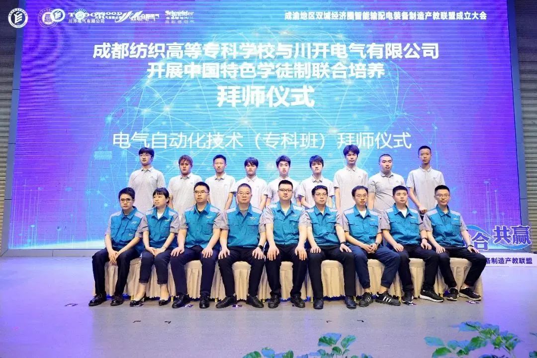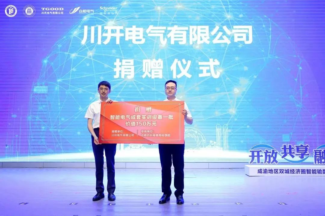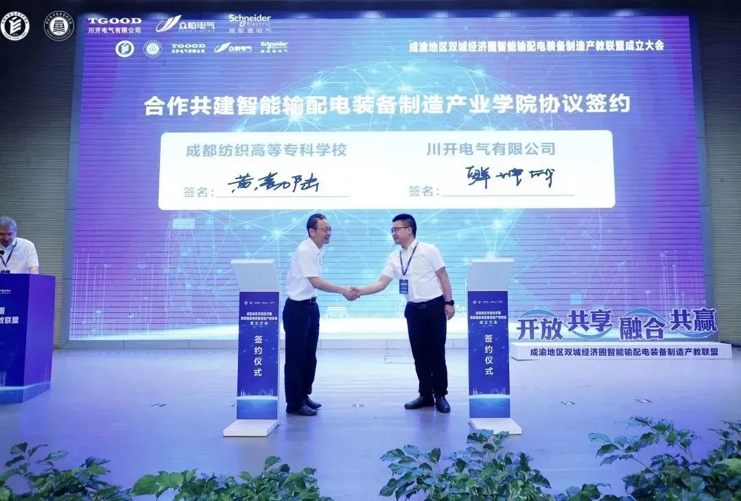 此次大會進行至校企合作項目啟動階段,特銳德川開電氣有限公司與成都紡織高等專科學校完成了合作共建智能輸配電裝備制造產業學院協議簽約。