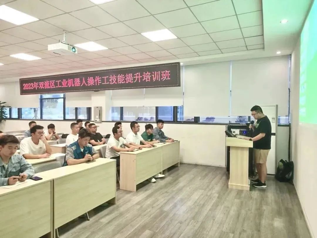 本次培訓由雙流區工會聯合成都技師學院組織,特銳德川開電氣有限公司、大陸希望集團、希望森蘭科技股份有限公司、四川多聯實業有限公司、成都盛幫密封件股份有限公司、成都歐賽醫療器械有限公司等多家企業職工參訓。培訓分為理論培訓和實操培訓兩部分,同時邀請了成都工匠代表做為特邀嘉賓講述《工匠文化》《工匠精神》系列課程。四川省技術能手陳盛老師作為理論及實操課程的培訓老師,針對工業機器人的操作,從工業機器人的系統認知、編程應用、拆裝調試、保養維護等多個方面對工業機器人的應用操作進行了系統性的講解。