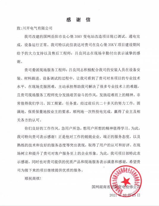 ? ? ?在國網岳陽市良心堡35KV變電站改造項目建設中,川開電氣有限公司售后工程師呂良積極配合國網湖南省岳陽變電檢修公司安裝人員進行設備安裝、材料跟進、設備調試,期間他勇于克服困難,主動承擔很多專業技術上的難題,充分發揚艱苦奮斗的作風與迎難而上的精神,經過前后20多天的努力,順利一次性投電完成,贏得業主和相關各方的高度認可。