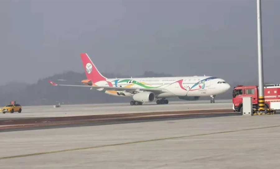 上午10時10分,承載著“十全十美”美好祝愿的四川航空A330“成都大運號”率先降落在天府機場西一跑道上。