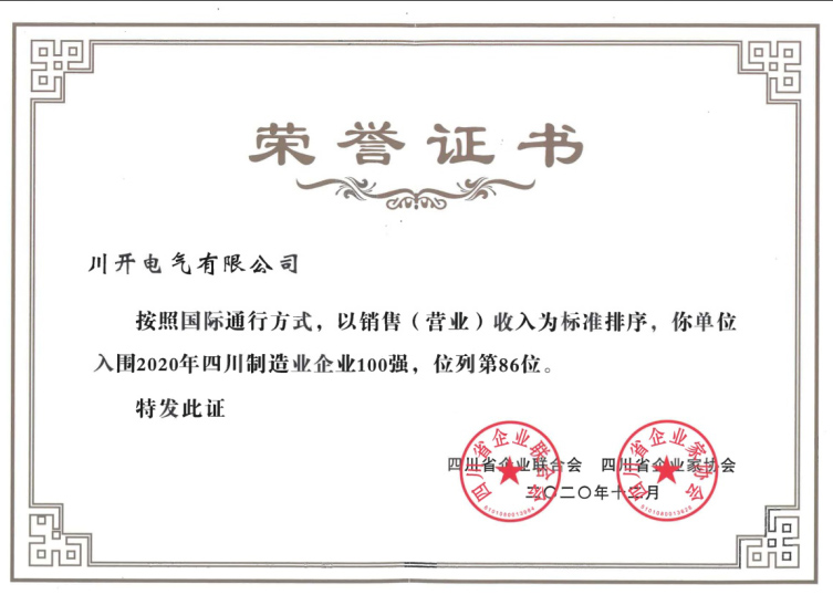 1月7日,2020四川企業(yè)100強發(fā)布會在成都召開。會上,四川省企業(yè)聯(lián)合會推出《四川企業(yè)發(fā)展報告(2020)》。發(fā)展報告收錄2020年四川企業(yè)100強、制造業(yè)企業(yè)100強、服務業(yè)企業(yè)100強、納稅和利潤10強、數(shù)字經(jīng)濟企業(yè)50強和中國企業(yè)500強榜單數(shù)據(jù)及分析報告。川開電氣有限公司入圍“2020四川制造業(yè)企業(yè)100強”。