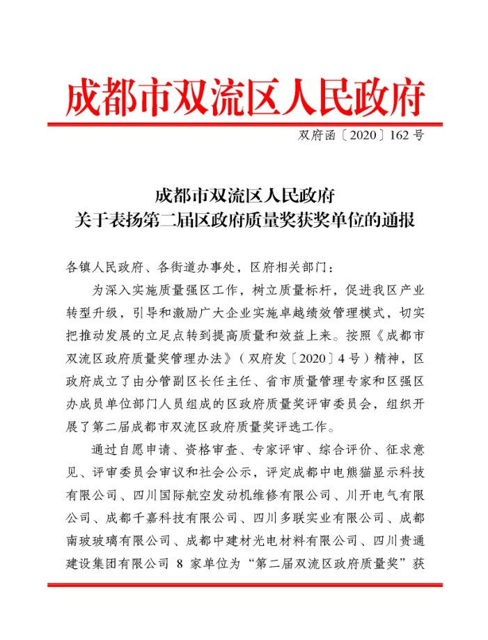 日前,川開電氣有限公司榮獲第二屆雙流區政府質量獎。