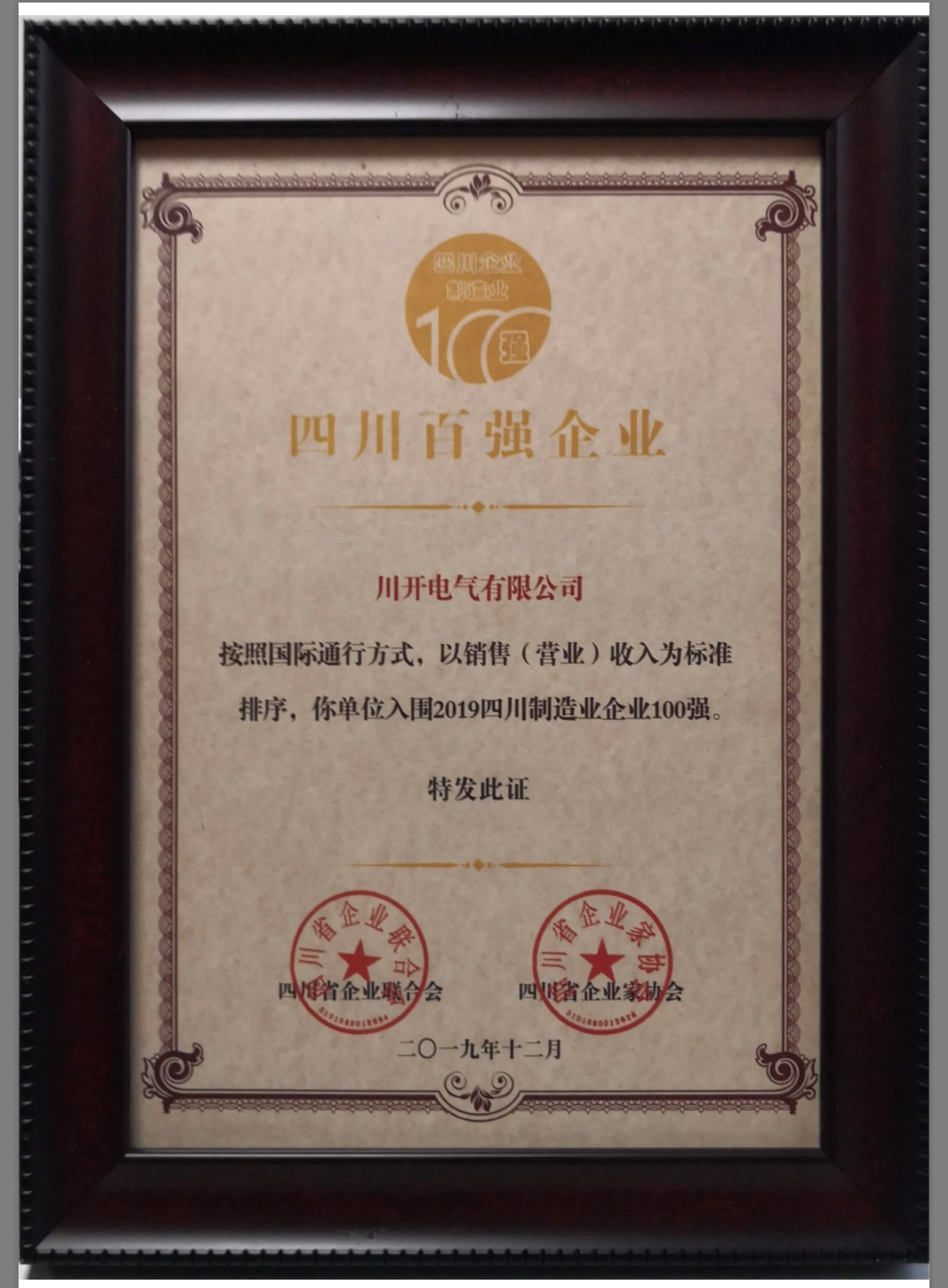 川開電氣有限公司再次蟬聯四川制造業企業100 強,這是對川開電氣發展壯大的肯定和鼓勵。