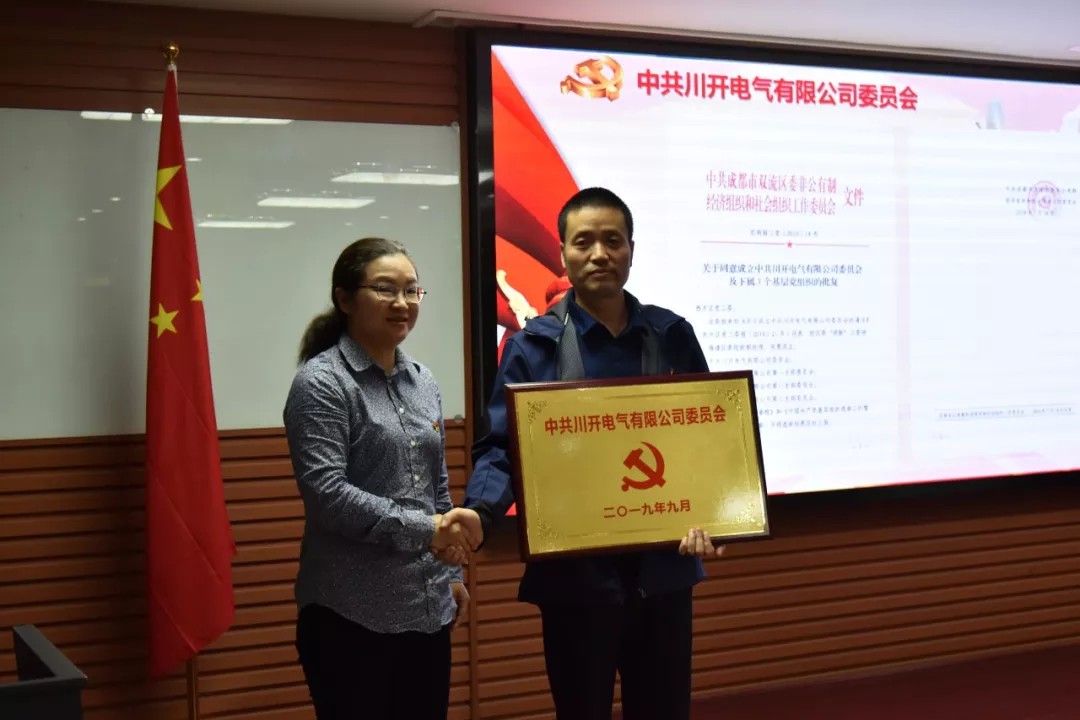 雙流區(qū)委“兩新”工委副書記程茜宣讀雙兩新工委【2019】18號《關于同意成立中共川開電氣有限公司委員會及下屬3個基層組織的批復》并授牌。