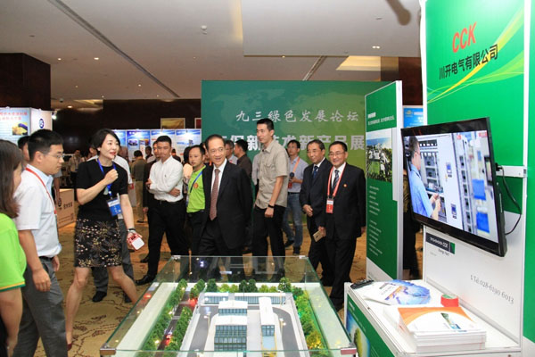 在環保新技術新產品展示巡展環節,川開電氣有限公司總工程師姬廣輝向全國政協副主席韓啟德等各級領導重點介紹了公司的“110kV城市中心模塊化智能箱式變電站”在未來城市微電網建設中的應用。該產品是國家電網重點推廣的新一代智能化變電站,具有安全可靠、占地面積小、建站周期短、外觀小精美、使用壽命長、無輻射、低噪音、布局靈活等優點。