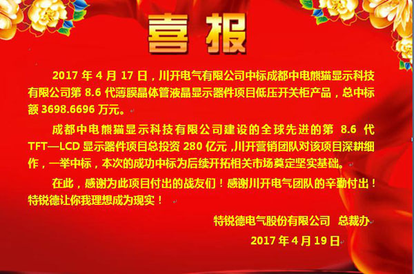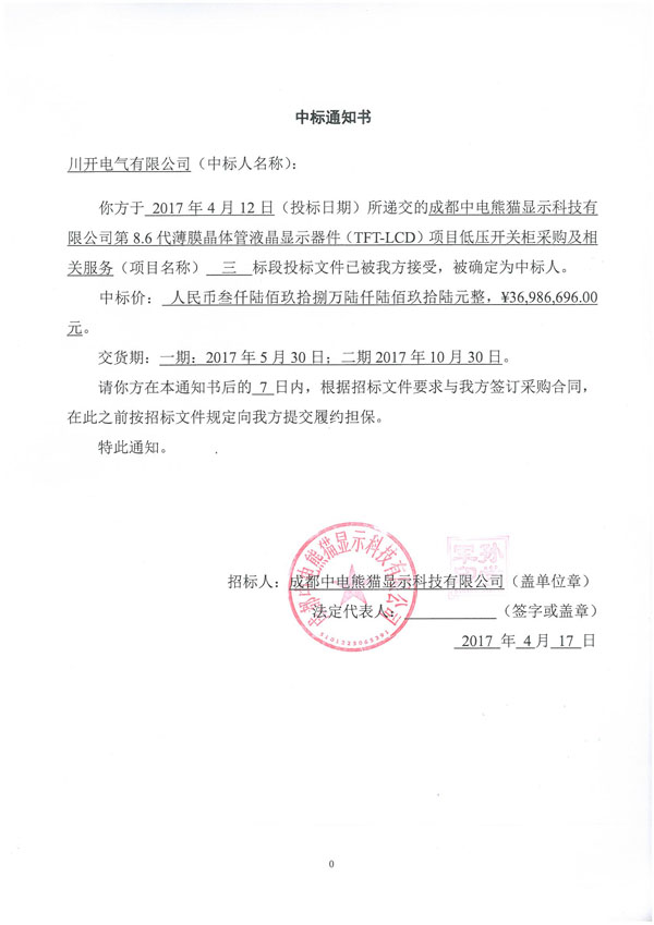 4月17日,公司收到成都中電熊貓顯示科技有限公司發(fā)來的中標通知書,公司成功中標第8.6代薄膜晶體顯示器件低壓項目開關柜及相關服務項目,中標金額為人民幣36986696元。