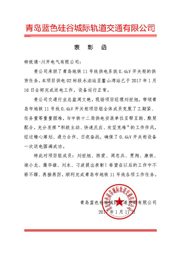 對(duì)于此次超高效率的完成任務(wù),青島特銳德集團(tuán)特地對(duì)川開(kāi)電氣駐青島項(xiàng)目同事進(jìn)行了表彰。對(duì)大家的努力表示肯定的同時(shí),也希望能夠再接再厲,未來(lái)做的更加的出色。