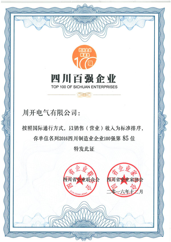 2016年12月2日上午在成都召開了“2016 四川企業(yè)100強(qiáng)發(fā)布暨企業(yè)發(fā)展峰會(huì)”。由四川省企業(yè)聯(lián)合會(huì)、四川省企業(yè)家協(xié)會(huì)組織,對(duì)2016年四川企業(yè)100強(qiáng)、四川制造業(yè)企業(yè)100強(qiáng)、四川服務(wù)業(yè)企業(yè)50強(qiáng)予以表彰,川開電氣有限公司榜上有名。