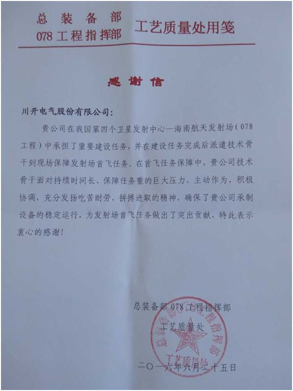 川開電氣作為文昌發射中心的優質供應商,總共承接了包括發射區等多個變電站的中低壓成套設備供貨及安裝調試。自2013年3月25日首批設備進場到2016年6月25日火箭成功發射,總歷時39個月。川開電氣為祖國的航天事業全力傾情奉獻,為長征七號成功發射做好輸配電保障。