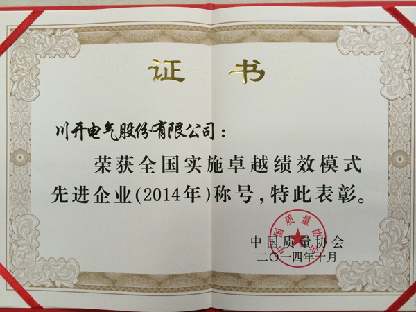 2014年10月10日,在中國質量協會組織召開的“全國實施卓越績效模式先進企業”表彰大會上,川開電氣股份有限公司榮獲“2014年全國實施卓越績效模式先進企業”稱號。 “2014年全國實施卓越績效模式先進企業”評審是中國質量協會在各地區、各行業質協推薦的基礎上,依據國家頒布的《卓越績效模式評價準則》標準進行嚴格評審,旨在對改善產品和服務質量、推進管理創新、持續提升企業整體績效方面做出成績的企業給予榮譽和表彰。此次全國共有115家企業單位獲得此項殊榮,我公司是國內輸配電開關設備行業唯一獲此殊榮的企業。