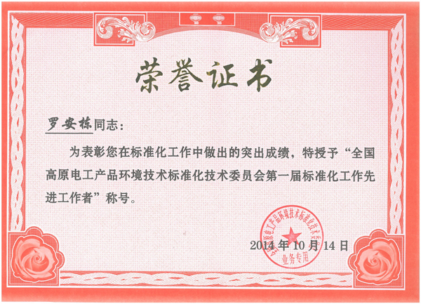 2014年10月13日~15日,全國高原電工產品環境技術標準化技術委員會換屆大會暨標準審查會在云南昆明進行。會議對第一屆標準化工作先進工作者進行了表彰并對第二屆標準化技術委員會委員進行了聘任,我公司羅安棟先生榮獲第一屆標準化工作先進工作者稱號并被列席為第二屆全國高原電工產品環境技術標準化技術委員會委員。