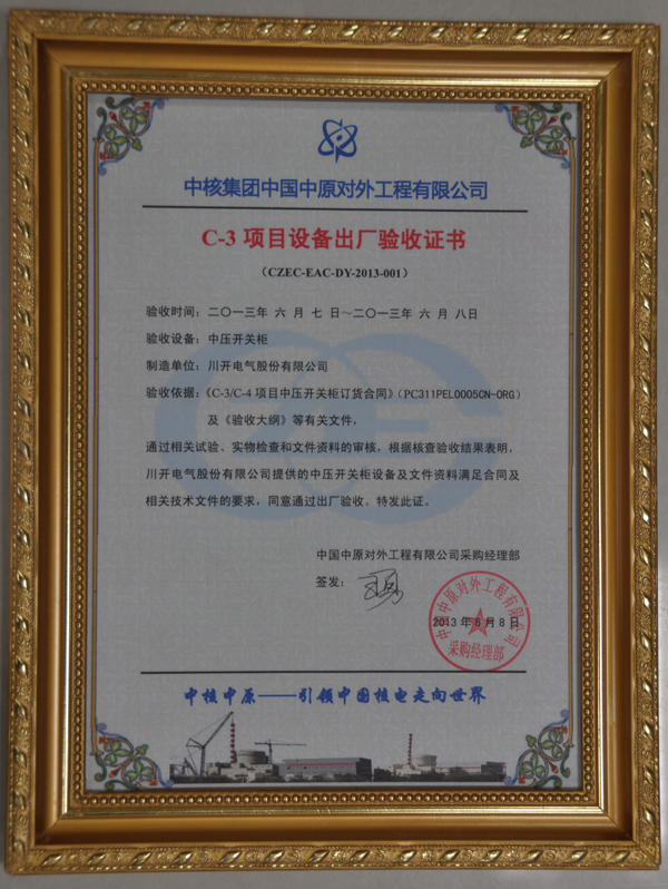 2013年6月5日至8日,由中國中原對外工程有限公司與上海核工程研究設計院專家組成的驗收小組對我公司制造的巴基斯坦恰希瑪核電站C3項目中壓開關柜進行了出廠驗收。中國中原對外工程有限公司副總經理王永革、中國中原對外工程有限公司上海分公司副總經理王勇出席了此次驗收會議。