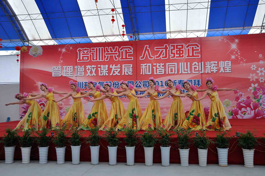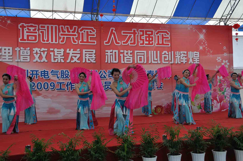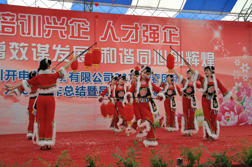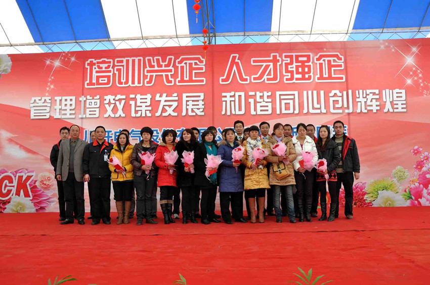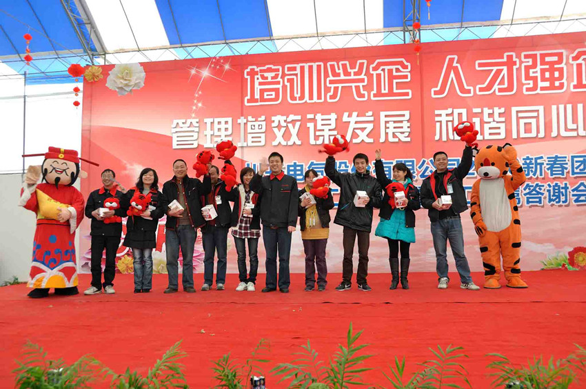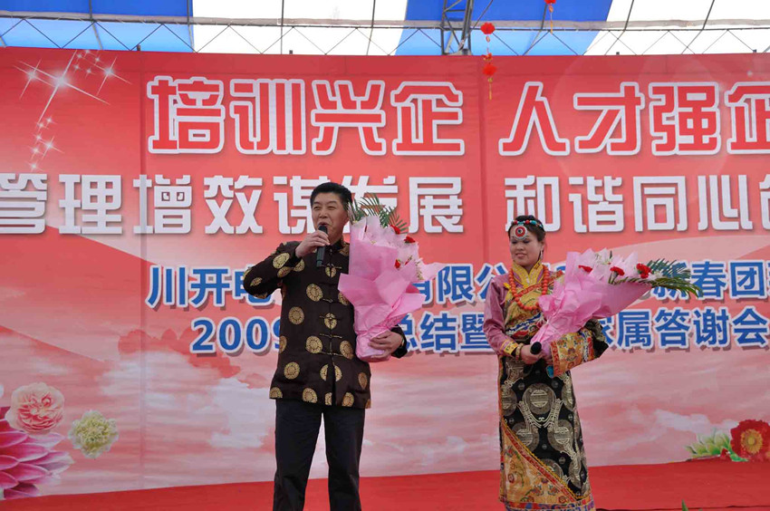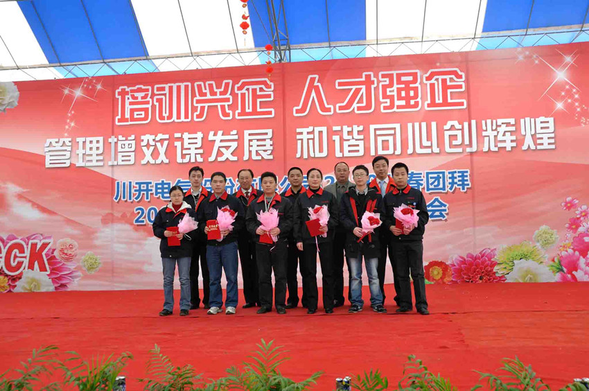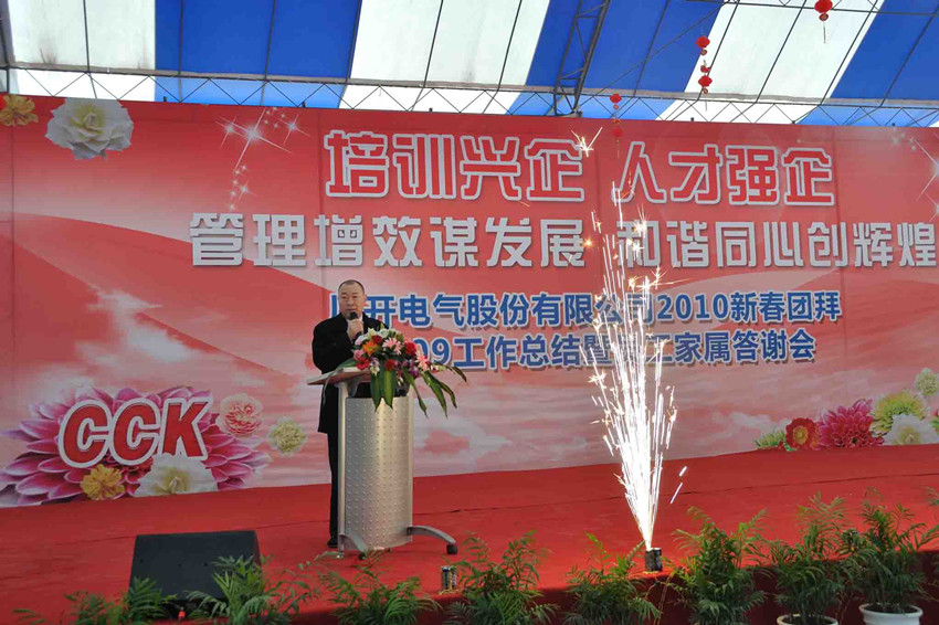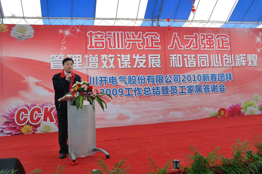 ??? 歡歌笑語辭舊歲,滿懷信心迎新年。2010年2月9日,川開電氣股份有限公司成品庫房內張燈結彩,暖意融融。上午9:30時,以“培訓興企、人才強企、管理增效謀發展、和諧同心創輝煌”為主題的“2009年工作總結、 2010新春團拜會暨員工家屬答謝會”隆重拉開序幕。集團領導、兄弟單位來賓、全體員工及家屬代表們等800余人歡聚一堂,暢敘情誼,共迎新春。