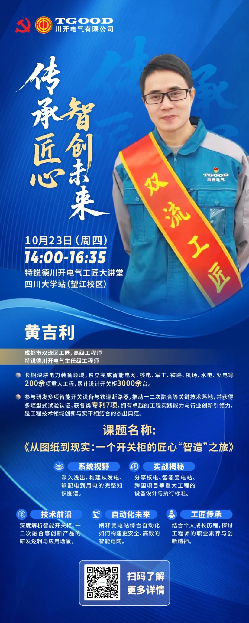 10月23日,以“傳承匠心 智創未來”為主題的特銳德川開電氣45周年工匠大講堂在四川大學電氣工程學院首站啟幕,黨員先鋒代表、雙流工匠、特銳德川開電氣技術高級工程師黃吉利為學院近60名2022屆本科生帶來了《從圖紙到現實:一個開關柜的匠心“智造”之旅》工匠講堂。